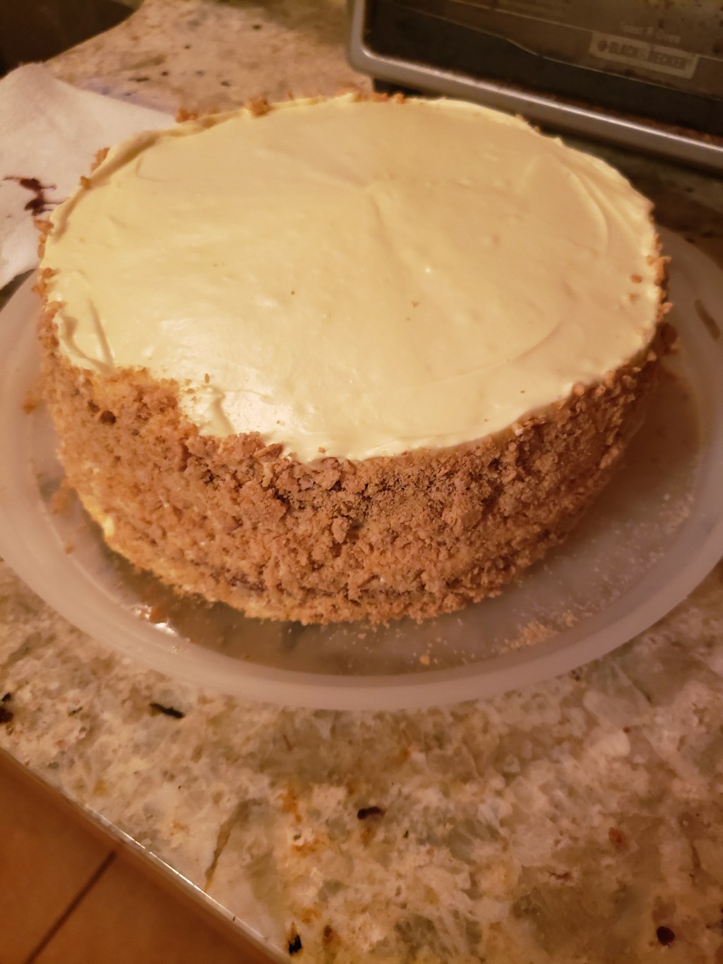 Pulse the graham crackers in a food chopper to get thin cracker crumbs. Add to the sides of the iced cake. The more the merrier! They add great flavor when mixed with the icing plus they're yummy!
