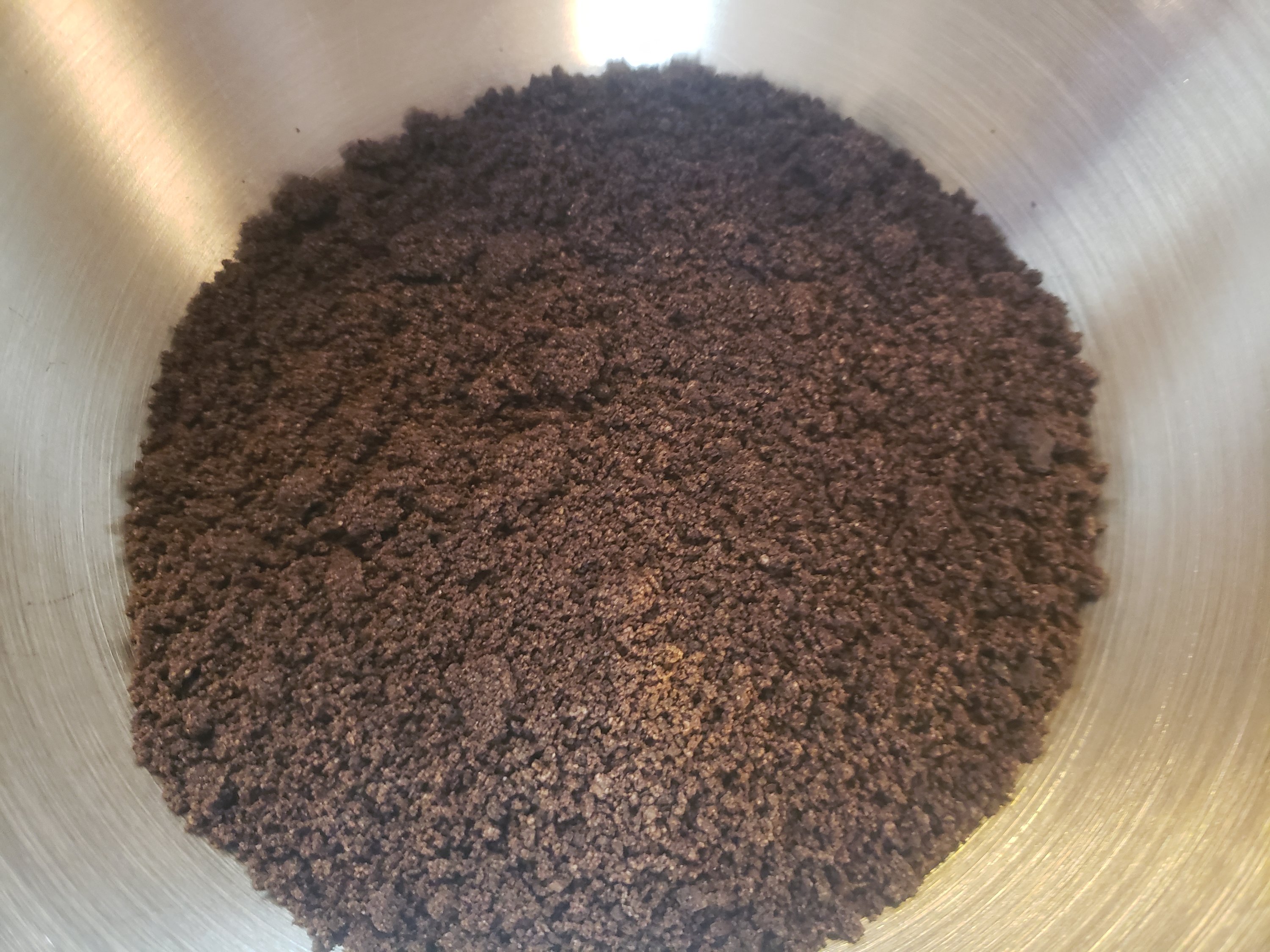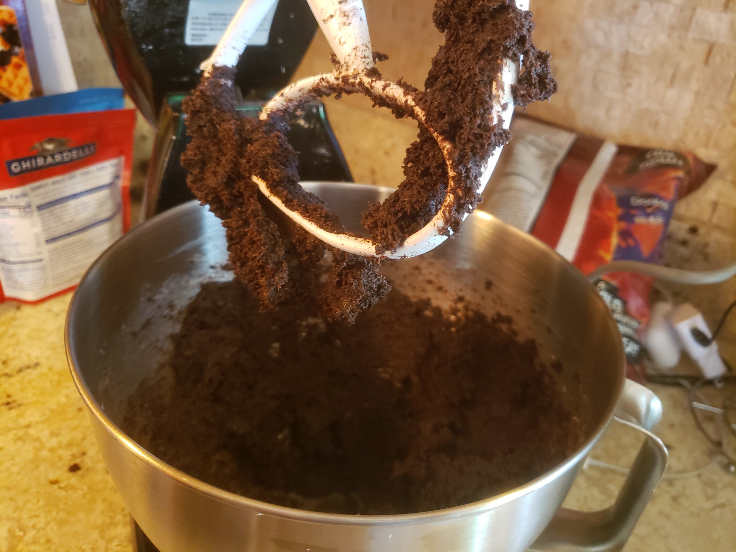 Crush the full oreos, middle frosting and all, in a food processor, chopper, or blender, just get those suckers into powdery crumbs, no big lumps or it just isn’t the same. The should look like this when ready…