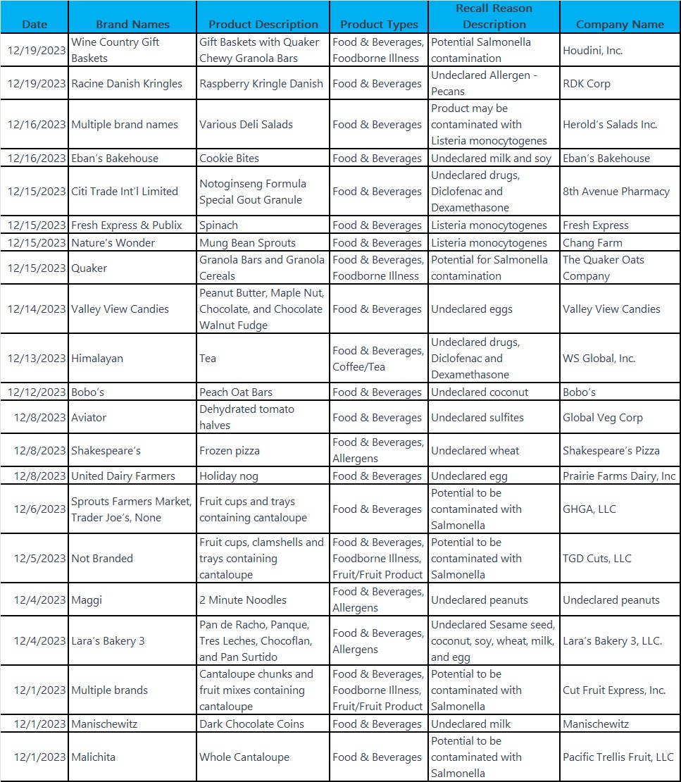 The most current recalls – December 2023: