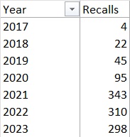 I was concerned that every time I open my internet browser that I see yet another food item recalled, there have been at least 5 today already. So I went to https://www.fda.gov/safety/recalls-market-withdrawals-safety-alerts and directly from their website you can download the recalls by year, so I did and I made a pivot table.. Anyone else concerned as hell at how we went from 4 in 2017 to averaging 317 recalls a year after 2020 on food and other items we consume or use?!